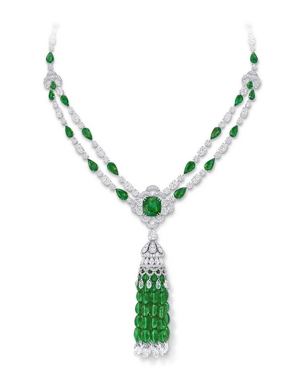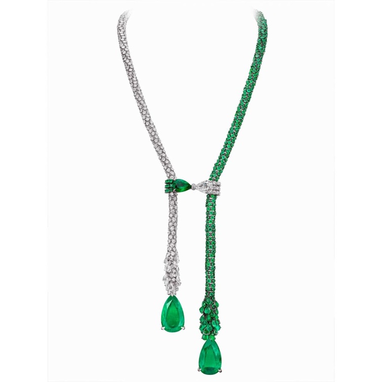 تختار غراف Graffالتصميمات التي تجعلها متميزة بمكانة فريدة في عالم المجوهرات مثل هذه القلادة الراقية من الذهب الأبيض والماس مزدانة بحجر زمرد يزن 11 قيراط وبقصة الوسادة بالاضافة الى أحجار متعددة بقصة الاجاصة وتصميم Tassel الذي يمنح التصميم لمسة كلاسيكية.