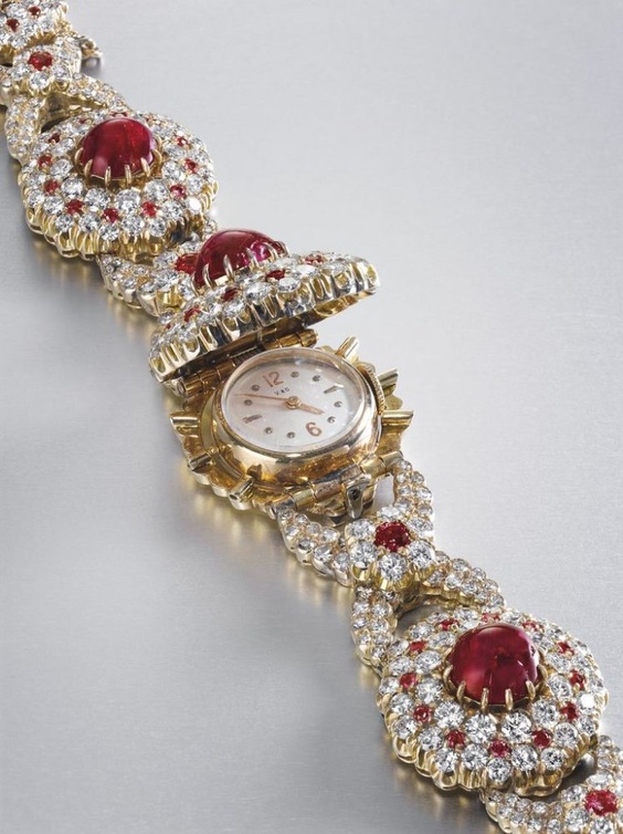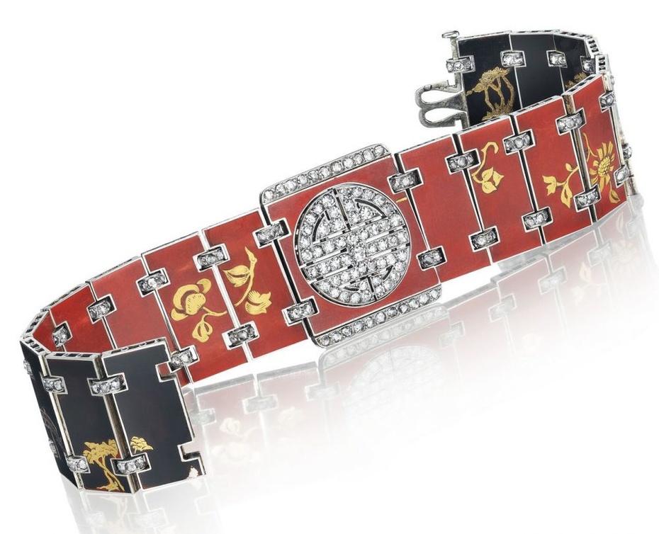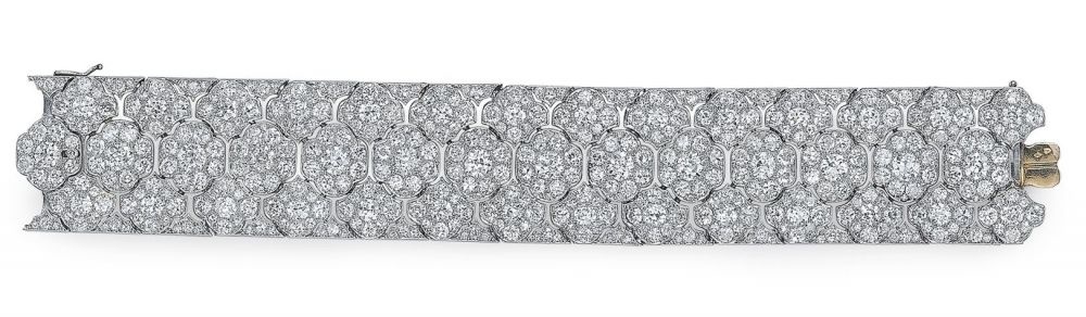 كما شملت المعروضات أساور خلابة من علامة كارتييه تعود الى العشرينات ومصممة بأسلوب الأرت ديكو الرائج وقتها وهي من الذهب الأبيض والماس.