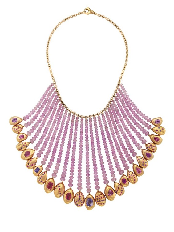 وكذلك شاهدنا قلادة تحمل توقيع الأمير ديميتري وهو أمير من العائلة الملكية اليوغوسلافية اتبع شغفه بعالم المجوهرات مؤسساً علامته الخاصة، والقلادة المعروضة من الذهب مع خرز من الياقوت الوردي بالإضافة الى قطع من الياقوت بألوان متنوعة بين الأرجواني والوردي والأحمر والبرتقالي.