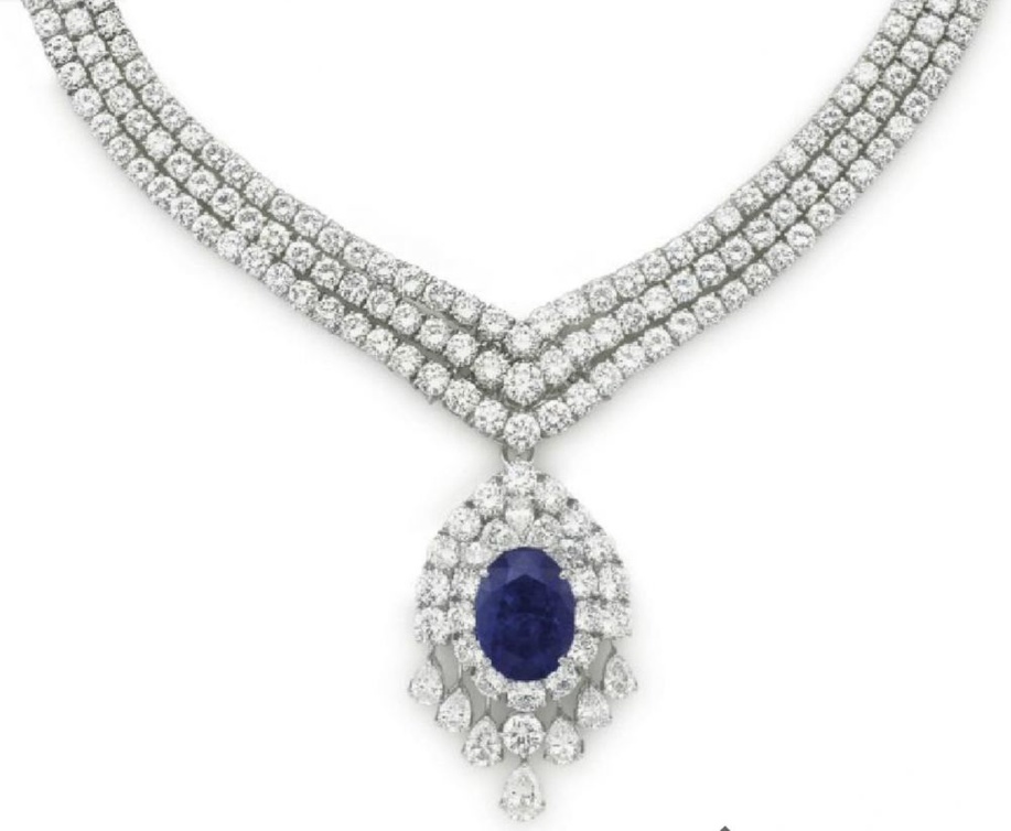 ومن القطع المعروضة في مزاد كريستيز قلادة فاخرة وملكية من الماس والذهب الأبيض مع قطعة راقية وفريدة من الياقوت الأزرق بقطع بيضاوي.