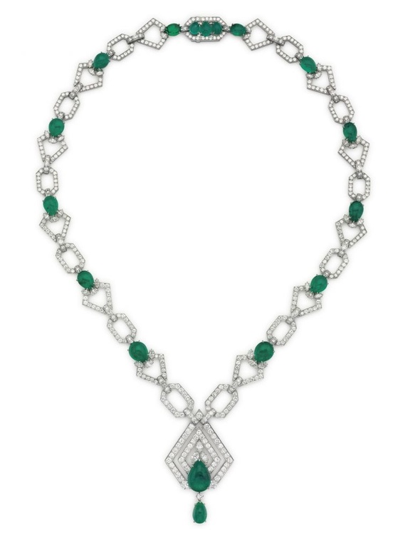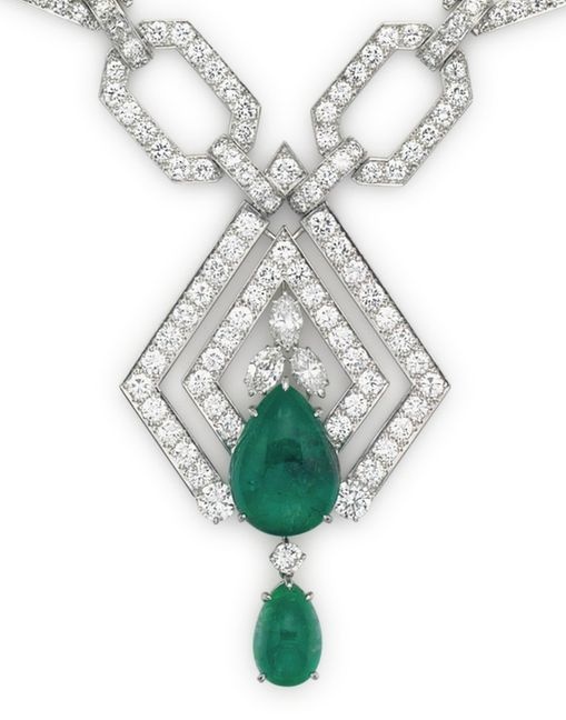 ومن المعروضات أيضاً قلادة فاخرة بلمسة الأرت ديكو تحمل توقيع علامة ديفيد ويب David Webb وهي بتصميم هندسي الطابع من الذهب الأبيض والماس مع الزمرد الفاخر.