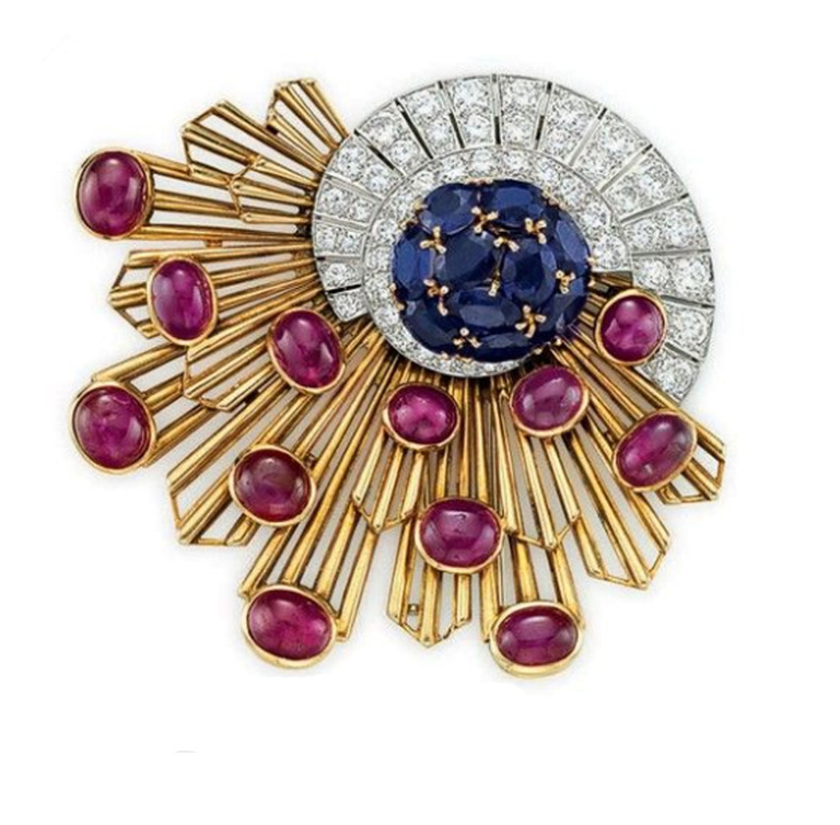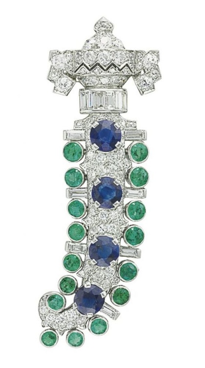 شاهدنا أيضاً بروش تاريخي يحمل توقيع علامة شارلتون بتصميم الخنجر وهو من الذهب الأبيض والماس مع الزمرد والياقوت الازرق الفاخر.