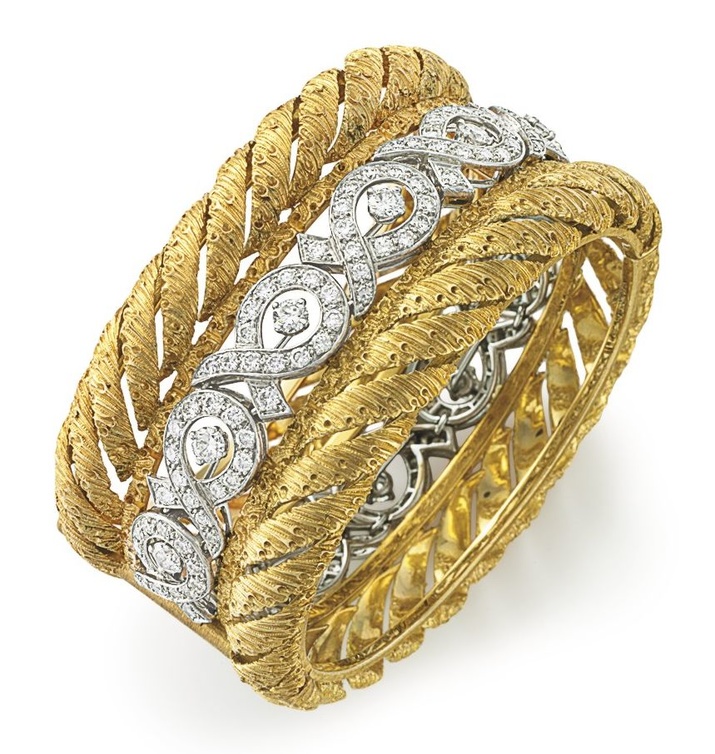 ومن القطع الفريدة أساور راقية ومتقنة من علامة بوتشيلاتي التي تشتهر بالذهب المطروق والمغزول بأسلوب مميز، وهي أساور تجمع الذهب الأصفر والأبيض مع الماس.