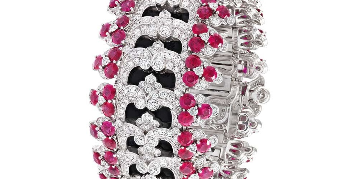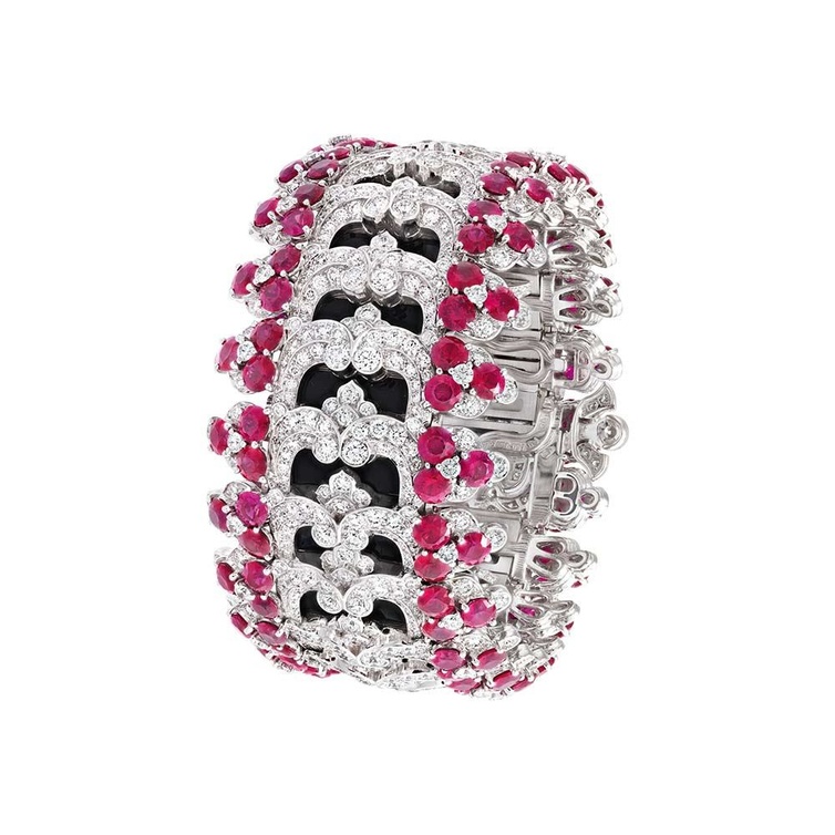 كما نختار من نفس المجموعة اسوارة راقية بتصميم ملكي ساحر من وحي الدانتيل قماش الانوثة الفاتن المغزول بالذهب الأبيض والماس والياقوت الأحمر.