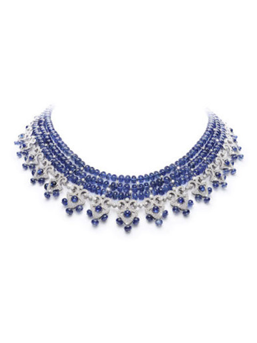 فخامة مترفة وتألق ملكي راقي يبدو واضحاً في تصميم قلادة من أحدث اصدارات علامة جيامبيرو بودينو والتي ستعانق سعيدات الحظ ببريق الماس والذهب الأبيض وسحر الياقوت الازرق.