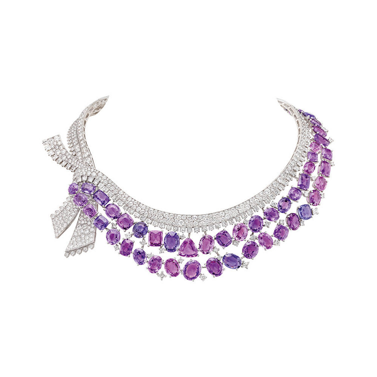وقد تلائمت القلادة مع تصميمات أرقى الفساتين الفاخرة بعذوبة وأنوثة من الذهب الأبيض والماس وأحجار الجمشت الساحرة.