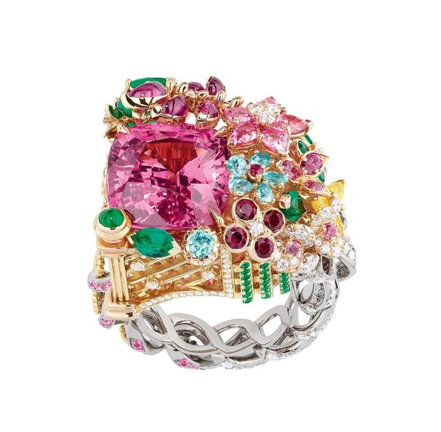 حدائق قصر الفيرساي بأزهارها وورودها وطيورها ومعمارها التاريخي تجسدت في مجموعة ديور الجديدة Dior à Versailles, côté Jardins..وقد اخترنا منها هذه الاسوارة التي تشدو بسحر الطبيعة وألوانها الخلابة بمزيج الذهب والماس والاحجار الكريمة.