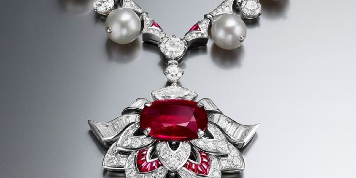 من علامة بولغاري نختار قلادة تتألق بالترف في تصميم من وحي زهور اللوتس بفخامة الذهب الأبيض والماس والياقوت الأحمر الموزمبيقي ولؤلؤ الأكويا الجذاب.
