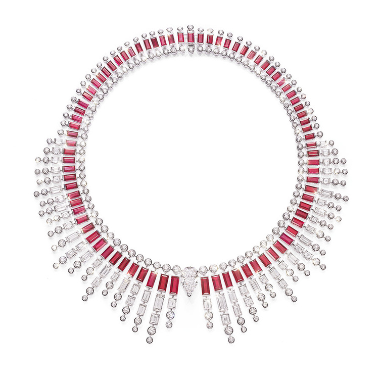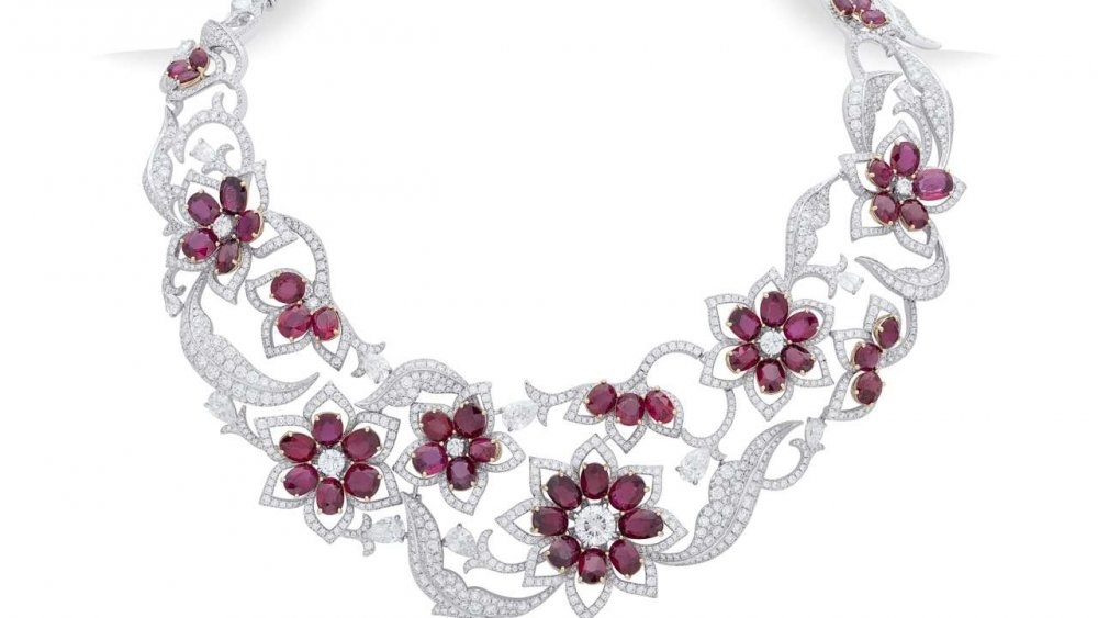 زهور الياسمين الهندي دائماً ما تلهم علامة نيراف مودي العلامة الهندية الفاخرة في عالم المجوهرات، وفي تصميم هذا العقد تتألق زهرات الياسمين بفخامة ودلال من الذهب الأبيض والماس وأحجار الياقوت الأحمر البورمي بقصة بيضاوية.