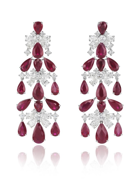 من علامة شوبارد نختار أقراط فاتنة بتصميم من الذهب الأبيض والماس والياقوت الأحمر بقصات الاجاصة بتصميم الثريا في أنوثة تليق بالسهرات الراقية.
