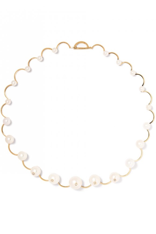 ومن جيما واين Jemma Wynne نختار عقد ناعم من الذهب الأصفر مع الروديوم وأحجار الماس مع حبات اللؤلؤ المتدرجة الحجم، كما نختار من دلفينا ديليتريه Delfina Delettrez عقد choker من الذهب الأصفر وحبات اللؤلؤ والماس.