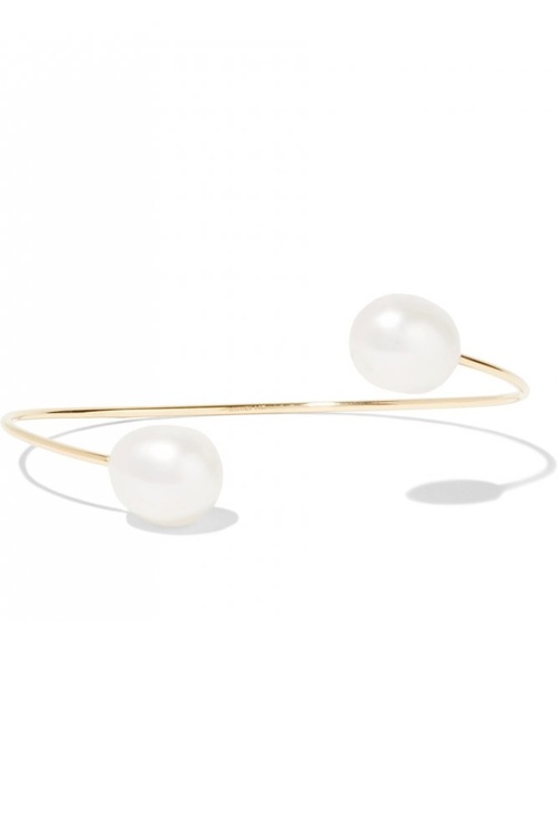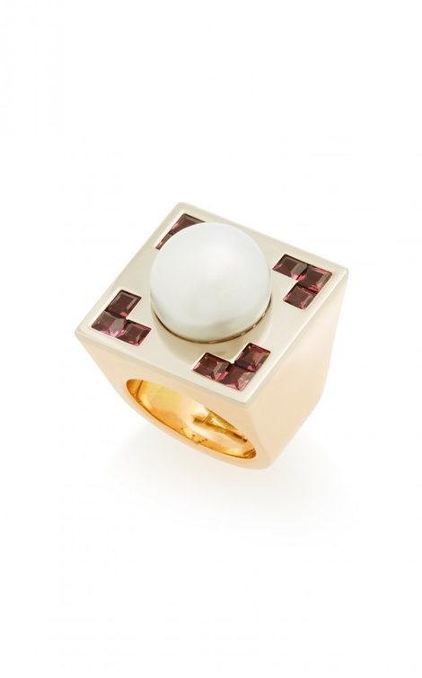 ومن ألينا أبيج Alina Abegg اخترنا خاتم بتصميم مربع من الذهب الأصفر والياقوت الأحمر وحبة لافتة من اللؤلؤ، وكذلك اسوارة من ميزوكي Mizuki بتصميم مفتوح من الذهب الأصفر واللؤلؤ.