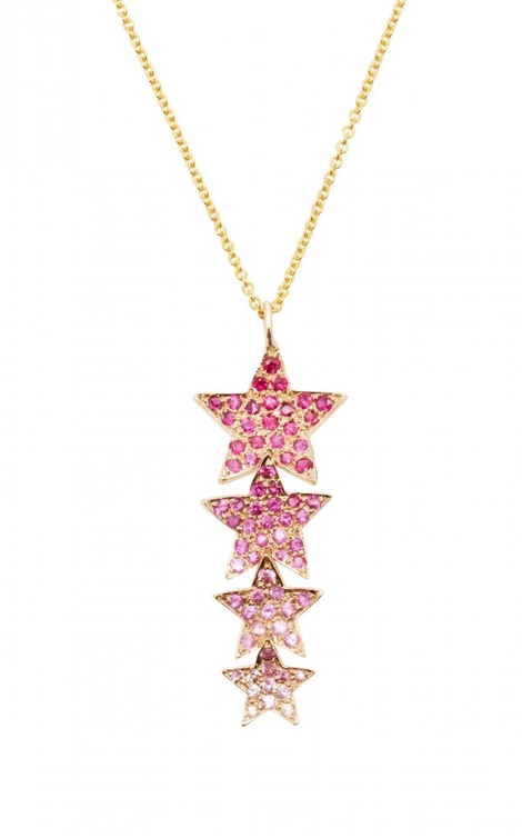 ومن علامة She Bee اخترنا سلسلة جذابة بتصميم النجوم من الذهب الأصفر وحبات الياقوت الوردي، ومن سوزان كالان Suzanne Kalan نختار سلسلة من الذهب الوردي والماس وأحجار الياقوت الملون.