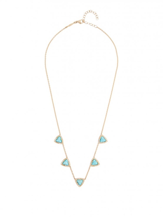 فمن علامة جاكي آيش Jacquie Aiche اخترنا سلسلة من الذهب الأصفر وحبات الماس مع حجر من الأجات المنحوت بنقشة لزهرة رقيقة، كما نختار سلسلة أخرى من الذهب الأصفر والماس المرصوف وأحجار الفيروز.