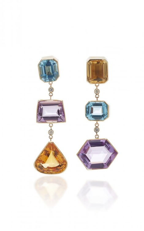 من علامة برنت نيل نختار أقراط فاتنة بتصميم هندسي لافت من الذهب الأصفر وأحجار التوباز الأزرق والسترين والجمشت.