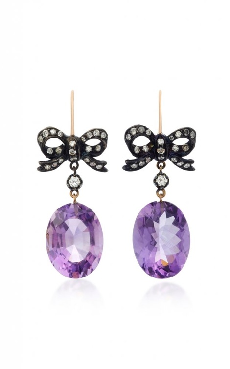 من علامة مونتس استيف نختار أقراط جذابة بتصميم شاعري كلاسيكي في نعومة راقية من الذهب الوردي والذهب المطلي باللون الأسود مع الماس وأحجار الجمشت البيضاوية.