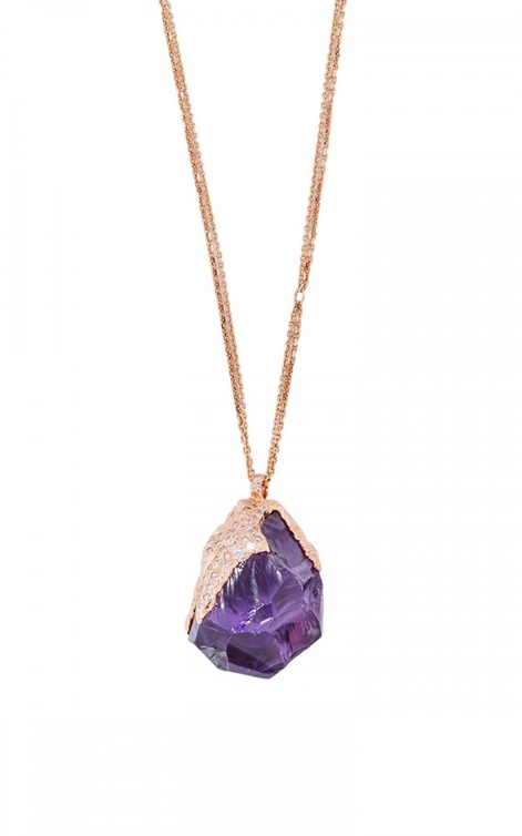 من علامة ناتالي ديسيل نختار سلسلة متألقة بحيوية عصرية في تصميم من الذهب الوردي والماس المرصوف مع حجر الجمشت بقصة الصخور الطبيعية.