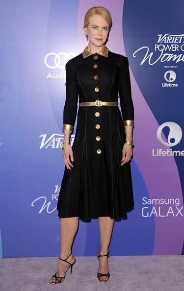 النجمة الكبيرة Nicole Kidman بدت مختلفة تماماً في ذلك الفستان الأسود المحتشم، بياقته النحاسية، وأزراره وحزامه وأساور أكمامه النحاسيين أيضاً، والذي حمل توقيع L'Wren Scott، والذي ظهرت به في حفل Variety's 5th Annual Power of Women في Beverly Hills بكاليفورنيا.