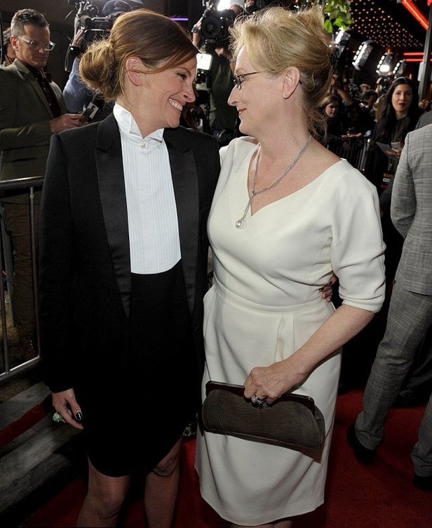 أما ميريل ستريب التي حضرت العرض إلى جانب جوليا روبرتس، فتالقت بفستان أبيض بسيط مع أكسسورارت ناعمة وبدا خيارها أفضل بكثير من زميلتها. ومع أننا نرى ترشيح جوليا لجائزة Golden Globe يلوح في الافق، إلا أنها بالتأكيد لن تحصل على جائزة في الاناقة على ملابسها يوم أمس. ولكن هذا لن يقلل من إعجابنا بها وبأناقتها التي عهدناها بها دائماً.