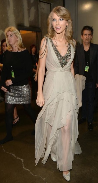 أما النجمة الجميلة Taylor Swift فبدت كإحدى آلهات الإغريق، بفستان Alberta Ferretti الرمادي الرائع من الشيفون، والمزين بورود سوداء عند الصدر، وشرائط معدنية مدلاة على الكتفين، عند تقديمها لفقرة غنائية في حفل the 2014 Grammy Awards في لوس أنجلوس.