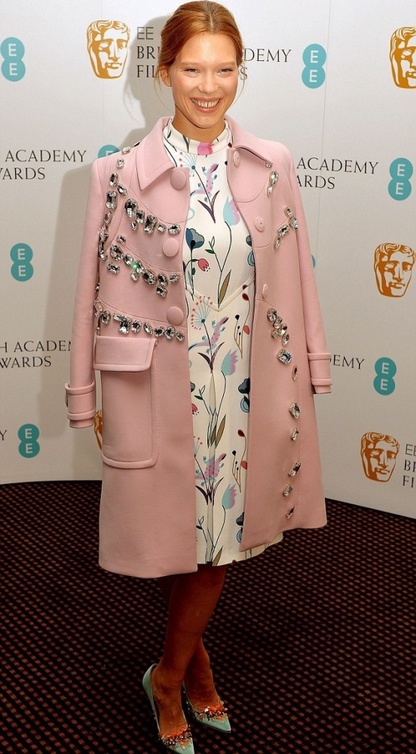 البداية كانت مع النسخة الفرنسية، حيث ظهرت النجمة الجميلة Lea Seydoux بهذا الفستان في حفل the EE Rising Star award ضمن فعاليات مهرجان BAFTA في لندن، وقد أضافت لإطلالتها حذاء بلون تركوازي صافي لنفس الدار، ومعطف بطول الفستان له لون وردي رائع يحمل توقيع Prada.