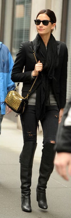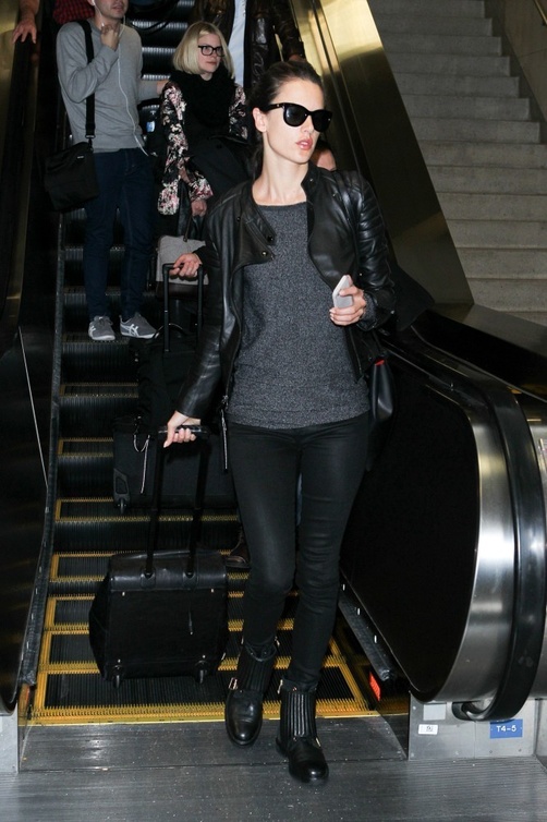 يبدو أن ذوق عارضات الأزياء به نوع من التقارب، الجميلة Alessandra Ambrosio إختارت إطلالة بسيطة يغلب عليها اللون الأسود أيضاً، تتكون من بنطلون ضيق، وجاكيت جلد قصير كلاهما باللون الأسود، مع بلوزة باللون الرمادي الداكن.