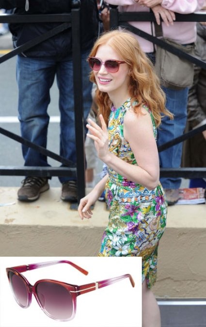 4- اختارت Jessica Chastain نظارات شمسية من ابداعات Karl Lagerfeld، التي انسجمت مع هذا الفستان الربيعي المتيز بنقوشات الأزهار