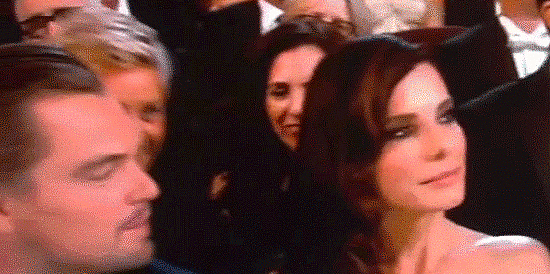 ألين دي جينيريس: والتي ظهرت في الخلفية أثناء إجراء مقابلة جانبية سريعة مع الممثلة ساندرا بولوك والممثل ليوناردو دي كابريو في حفل الأوسكار لعام 2014.