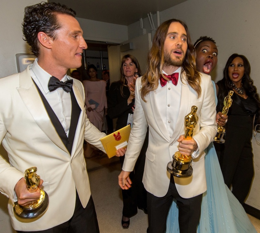 Lupita Nyong'o : ظهرت خلف جاريد ليتو وماثيو ماكونهي وراء الكواليس في المعرض 2014 الجائزة بطريقة مضحكة للغاية.