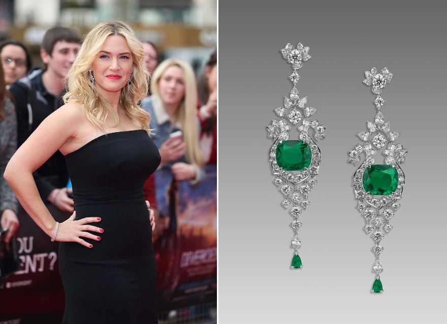 وأخيراً نعرض لكم أقراط كيت الرائعة التي ارتدتها في إطلاق فيلم Divergent في لندن من تصميم دار المجوهرات اللندنية David Morris؛ وتتكون الأقراط من مزيج من الماس الأبيض بقصة على شكل إجاص وأحجار ضخمة من الزمرد الرائع.