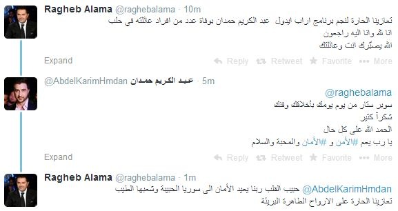أعرب الفنان اللبناني راغب علامة عن حزنه الشديد عقب وفاة مجموعة من أفراد عائلة نجم الموسم الثاني لبرنامج "محبوب العرب" عبد الكريم حمدان في حلب، قائلاً: "تعازينا الحارة لنجم برنامج آراب آيدول عبد الكريم حمدان بوفاة عدد من أفراد عائلته في حلب، إنا لله وإنا إليه راجعون، الله يصبّرك انت وعائلتك".