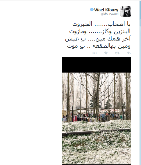 أما الفنان وائل كفوري فغرّد متضامنا مع الفقراء الذين يعانون بهذا البرد القارس ومنتقداً اصحاب "الجبروت" الذين يحتكرون أسعار المحروقات قائلا: "يا أصحاب الجبروت البنزين والكاز والمازوت آخر همك مين بِعيش.. ومين بهالصقعة بِموت"، وأرفق التغريدة بصورة من مخيم اللاجئين السوريين في لبنان حيث تغمره الثلوج.