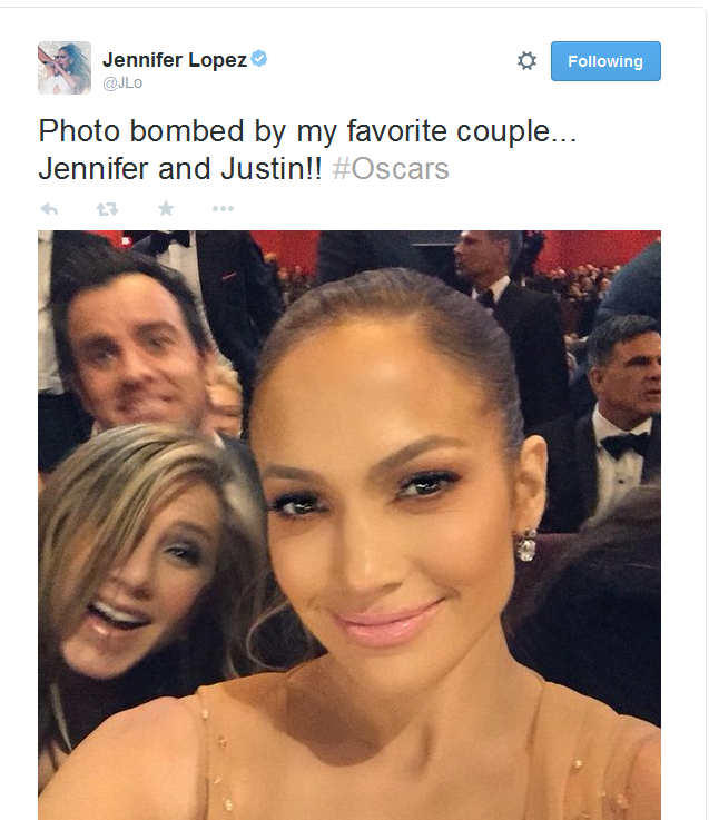جينيفر لوبيز أبهرت الجميع فى حفل الأوسكار وعلى موقع "تويتر" لكنها غردت تغريدة قد تشعل الغيرة بين أجمل ثنائيات هوليوود، فقد نشرت صورتها مع الجميلة جينيفر إنيستون وصديقها جاستين، ووصفتهما بالثنائي الأجمل والأقرب لقلبها.