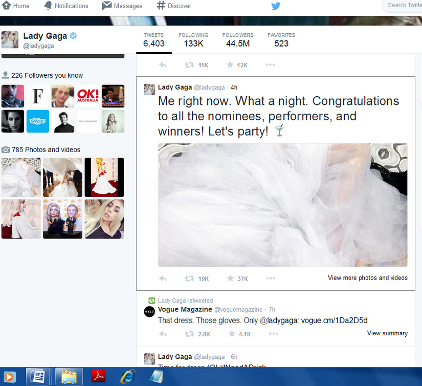بينما وجهت نجمة الحفل ليدى غاغا تغريدة شكرت فيها كل الحضور، وطالبت الجميع بنسيان النتائج والاحتفال بكل المرشحين، وقالت: "دعونا نحتفل!!"