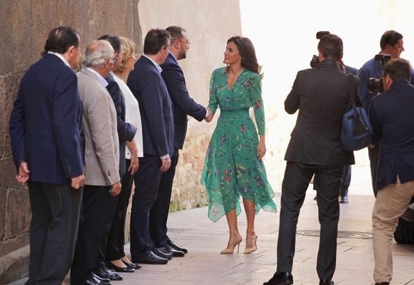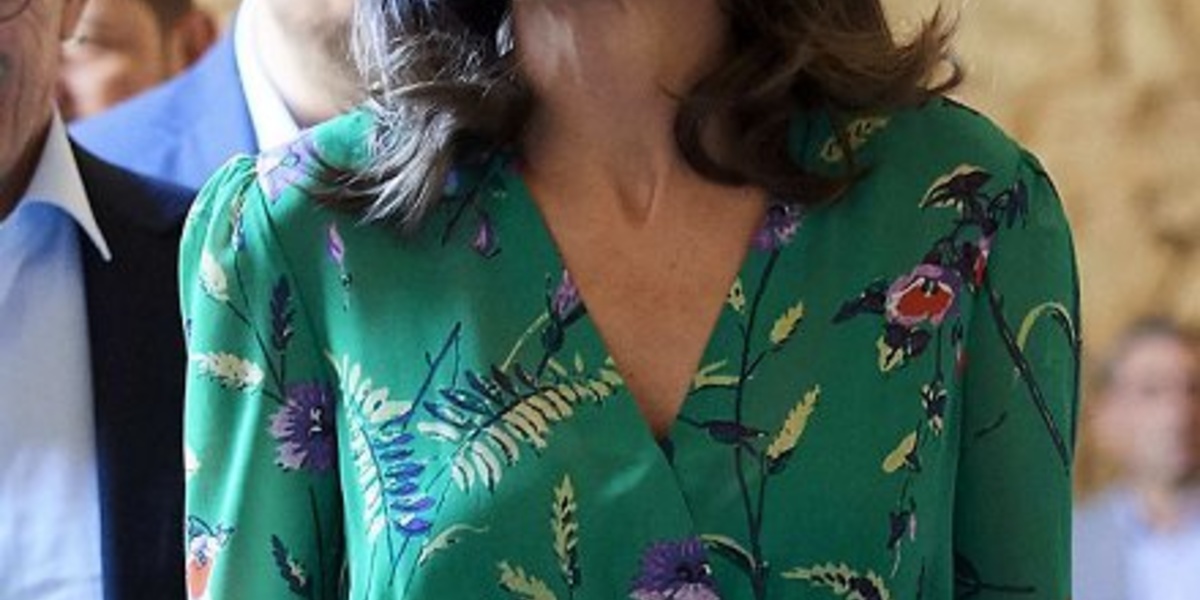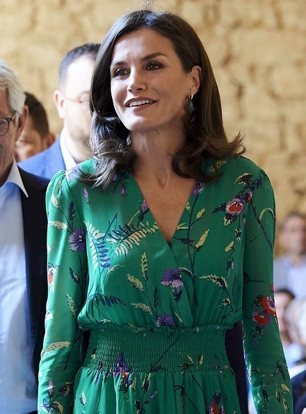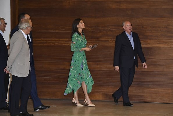 ملكة إسبانيا ظهرت في المؤتمر الافتتاحي في إطلالة عصرية أنيقة حيث ارتدت فستان حريري أنيق طويل الأكمام يحمل طبعات زهرية أنيقة وهو من تصميم ماركة Maje Paris.