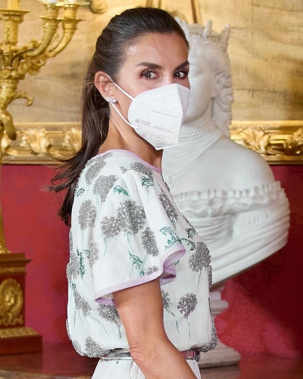 الملكة ليتيزيا 48 عام، ظهرت بفستان الملكة صوفيا، 82 عام، عندما انضمت إلى زوجها الملك فيليب السادس في استقبال الرئيس التشيلي سيباستيان بينيرا Sebastián Piñera، في القصر الملكي في العاصمة الإسبانية مدريد هذا الأسبوع، قبل استضافتهما في وقت لاحق لمأدبة غداء رسمية لرئيس تشيلي.