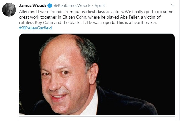 الممثل والمنتج الأمريكي جيمس وودز نعى صديقه الراحل عبر حسابه على "تويتر" حسب كتب تدوينة قصيرة عبر فيها عن مدى حزنه على رحيل ألين جارفيلد الذي شاركه رحلة كفاح طويلة في عالم التمثيل والتي بدأت مع فيلم " Citizen Cohn"، وأكد جيمس وود أن رحيل صديقه يعد محطم لقلبه فقال: "كنا أنا وألين أصدقاء من الأيام الأولى لنا كممثلين. حصلنا أخيرًا على عمل رائع معًا في (Citizen Cohn) ، حيث لعب دور أبي فيللر، وهو شخصية لا ترحم، لقد كان رائعا، رحيله محطم للقلب".