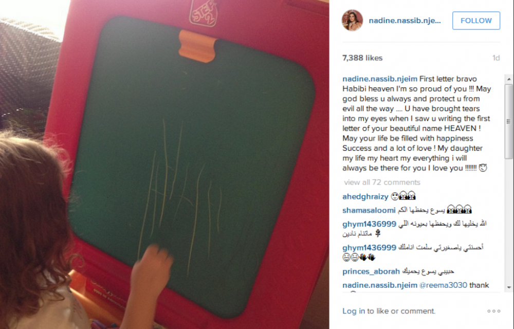 شاركت النجمة اللبنانية نادين نسيب نجيم جمهورها على موقع إنستقرام فرحتها بأول حرف تخطه ابنتها الصغيرة هيفين، وكتبت رسالة كلها فخر بابنتها ومحبة بعدما نجحت في كتابة أول حرف من اسمها.