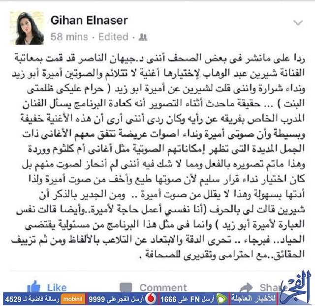 وأكدت في لقائها مع الإعلامي وائل الإبراشي ، أن الدكتورة "جيهان المدربة الخاصة بالفريق اعترضت على أغنية شادية التي اختارتها شيرين، ولكنها أصرّت على الأغنية ورفضت تغييرها، وطلبت منها أن تؤدي الأغنية بـنصف صوتها"، لافتة إلى أنَّها "من الممكن أن تبرز الجزء الناعم في صوتها في جملتين أو ثلاث وليس الأغنية بالكامل".