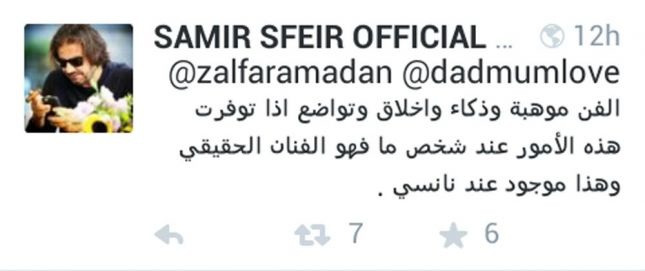 وكانت المناسبة افتتاح الموسم الثالث لديو المشاهير بمشاركة نجوي كرم، فالتقط سمير صفير الخيط وغرد معقبا،" لما حكينا وقلنا اللي قلناه قامت الدنيي ولم تقعد، وما ضلّ ولا قبوط ما طلع حكي وتفلسف على كل حال ما بيصح إلا الصحيح وشهد شاهد من قومه"، واضاف في تغريدة أخرى" أصبح الفن والفنون في لبنان مستواه مثل الطبقة السياسية ٢٠٪ على الرأس و٨٠٪ بيشبه النفايات يلي معبايه بشوارعنا ! للأسف الاعلام الفني وظيفته نقل الحقيقة وتثقيف الشعوب! وليس إقامة حفلات زجل كاذبة أو هدفها تمسيح جوخ لأجل غايةٍ في نفس يعقوب.