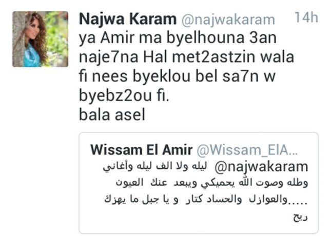 تضاعفت الأزمة عندما تدخل الملحن وسام الامير، الذي تعاملت مع نجوى كرم في عدد من الأغنيات، بتغريدة وجهها الى طوني عنقة قال فيها: إنت معلم ونحنا منك نتعلم"، وهنا تدخلت نجوي شخصيا للرد قائلة: "يا أمير ما بيلهونا عن نجاحنا هالمستأتزين، والله في ناس بياكلوا بالصحن وبيبزقوا فيه.. بلا أصل.