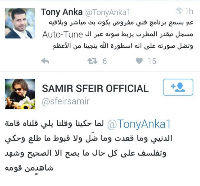 طوني عنقه الذي رافق نجوي كرم مؤخرا فى رحلة "على شط بحر الهوى"، وتولى توزيع أغنيتها "ع الصخرة"، افتتح المعركة بتغريدة قال فيها: عم بسمع برنامج فني مفروض يكون بث مباشر وبلاقيه مسجل يقدر المطرب يزبط صوته عبر ال Auto-Tune وتضل صورته على أنه أسطورة الله ينجينا من الأعظم".