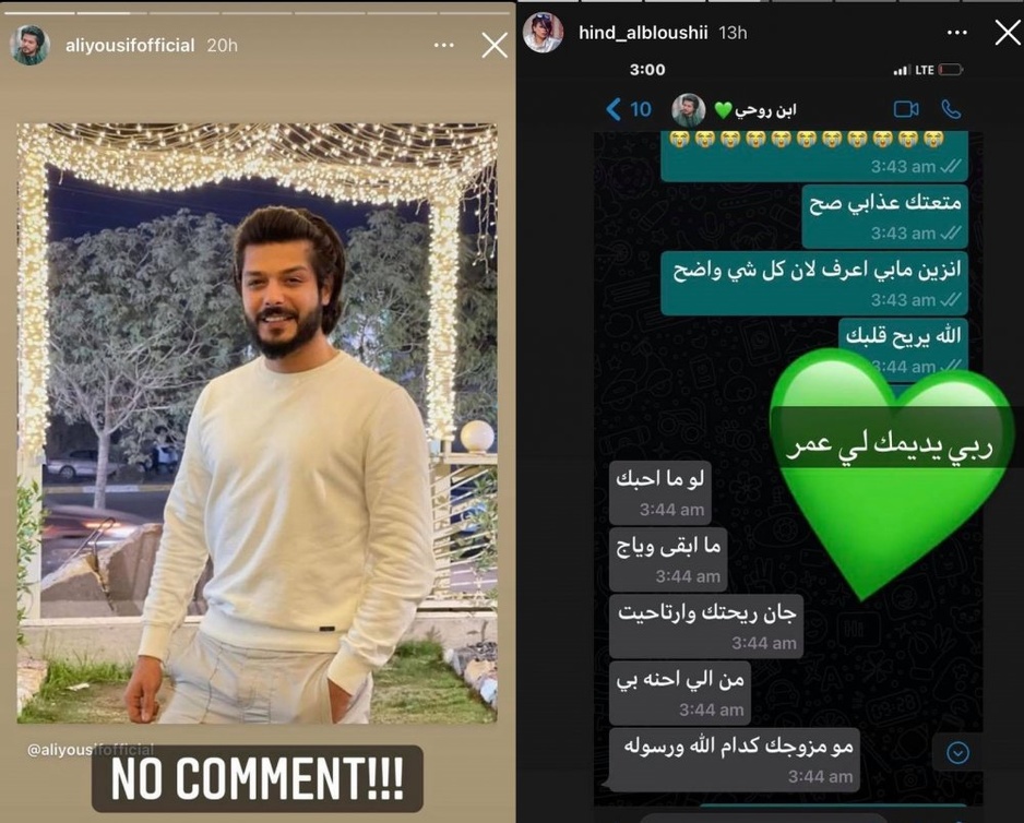 هند البلوشي عادت من جديد لتنشر بعض المعلومات الجديدة التي تؤكد من خلالها على زواجها من الفنان العراقي علي يوسف حيث قامت بنشر على خاصية "الأستوري" عبر حسابها على "انستجرام" صورة من محادثة أجريت بينها وبين الفنان العراقي الذي وصف ما تفعله هند البلوشي بالعذاب بالنسبة له لترد عليه قائلة: "لو ما أحبك ما أبقى وياج، جان ريحتك وارتاحيت من اللي أحنه بي، مو مزوجك كدام الله ورسوله"، ويبدو أن هند البلوشي ارادت نشر نص هذه المحادثة لتؤكد فيها على ارتباطها من الفنان العراقي الذي يكشف من حديثه عدم رضاه على الإعلان عن هذا الارتباط، وعلقت هند البلوشي على الصورة التي نشرتها فكتبت: "ربي يديمك لي عمر".