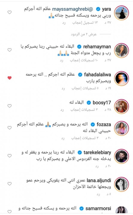 ميساء مغربي تقدم لها بالعزاء العديد من زملائها في الوسط الفني الذين حاول الكثير منهم التخفيف عنها ومواساتها في هذا المصاب الأليم وكان من بين النجوم الفنانة يارا التي علقت على ما نشرته زميلتها فكتبت: "عظّم الله أجركم وربي يرحمه ويسكنه فسيح جناته"، كما علقت أيضا الفنانة ريهام أيمن ودعت لوالد الفنانة ميساء مغربي فكتبت: "البقاء لله حبيبتي ربنا يصبركم يا رب و يچعل مثواه الجنة"، وعلق كذلك العديد من المشاهير والنجوم من بينهم الإعلامية المصرية بوسي شلبي، والكاتب فهد العليوة، والعنود بدر، و لمياء منهل، والفنان طارق الإبياري.