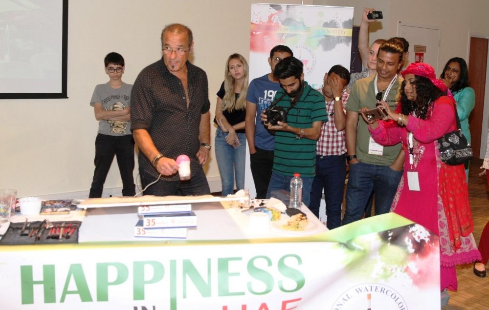 من جانبه قال سمو الشيخ محمد بن فيصل القاسمي:  أتينا في هذا المعرض برسامين من مختلف دول العالم يتسابقون من خلال لوحاتهم ومن خلال مهرجان "السعادة في الألوان المائية"، وهذا المعرض يأتي من خلال رؤية المستشفى واحتضانها لمختلف أشكال الفنون حول العالم، خاصة وأن الفن واللوحات لها جانب شفائي بخلاف جانبها الجمالي، حيث تبعث الطمأنينة والراحة في نفوس العديد من الأشخاص، أضف إلى ذلك أن عنوان المهرجان أيضاً يدل على مدى بث الألوان والرسومات للسعادة في نفوس الأشخاص وبالتالي كان اسمه "السعادة للألوان المائية.