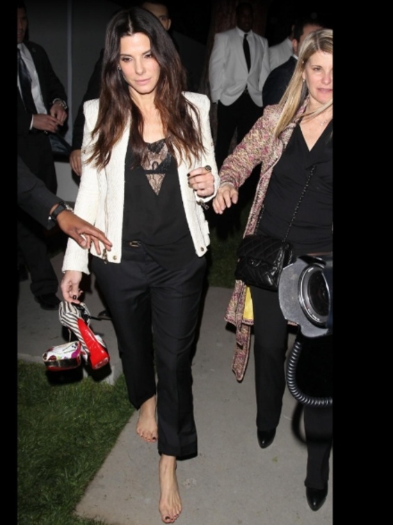 الاحذية الانيقة غالبا ما تكون غير مريحة على الاطلاق ولذلك فقد اسرعت النجمة ساندرا بولوك في نزع حذائها الانيق من ماركة " Louboutin" الذي يحمل نقشة جلد الحمار الوحشي وهي في طريقها لمغادرة واحدة من الحفلات التي تسبق حفل الاوسكار وكان ذلك في يوم 25 فبراير عام 2012.