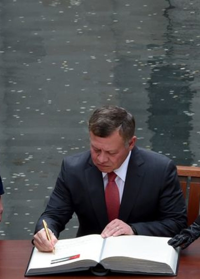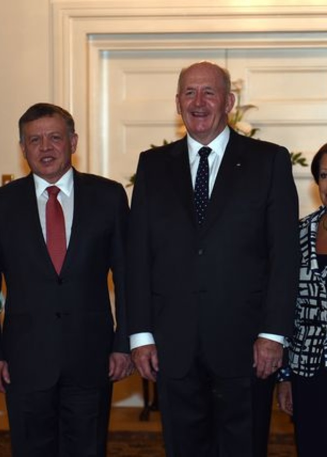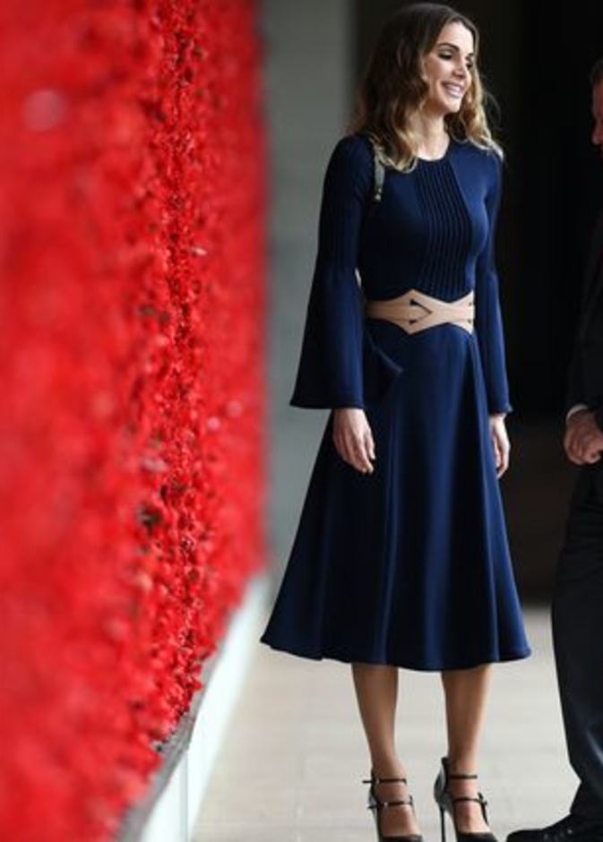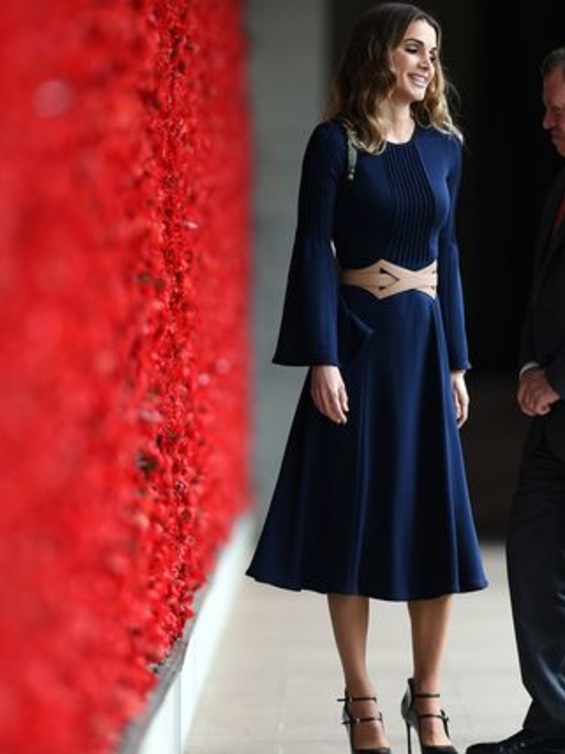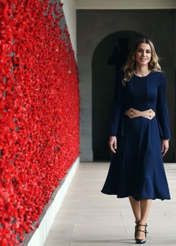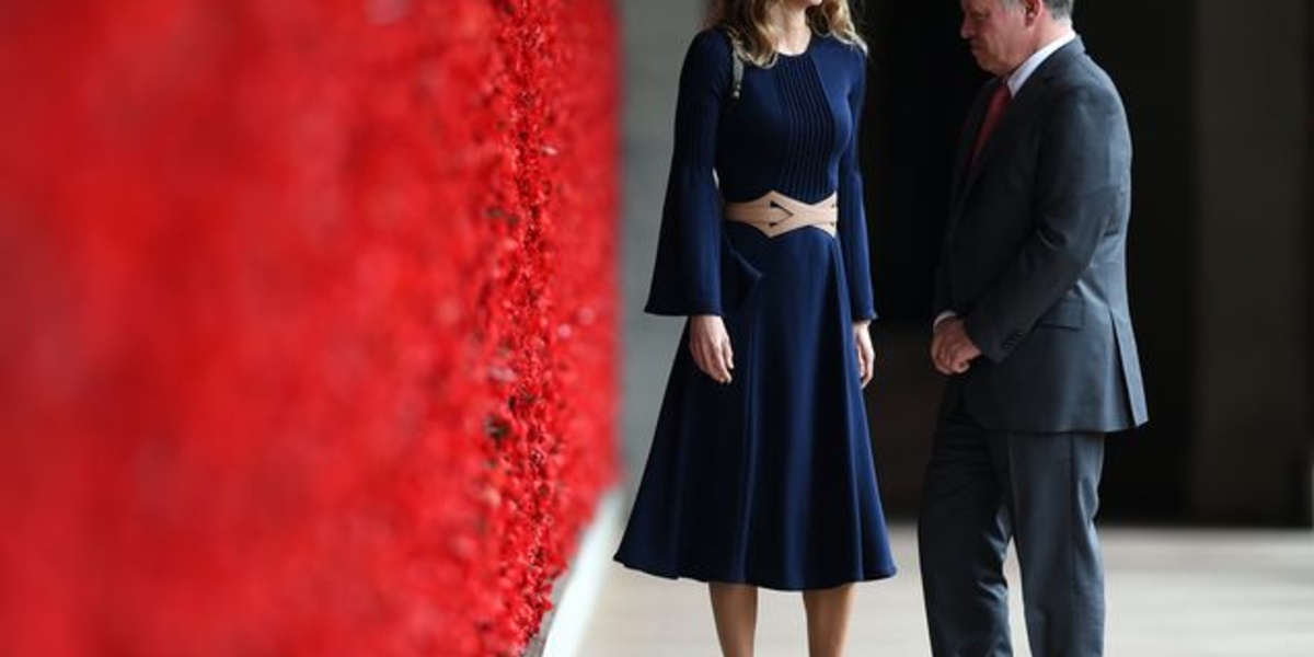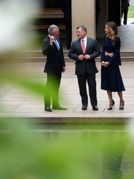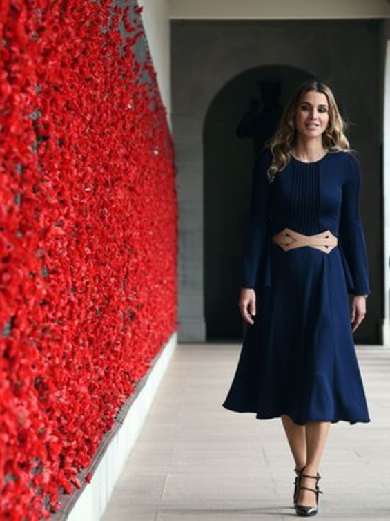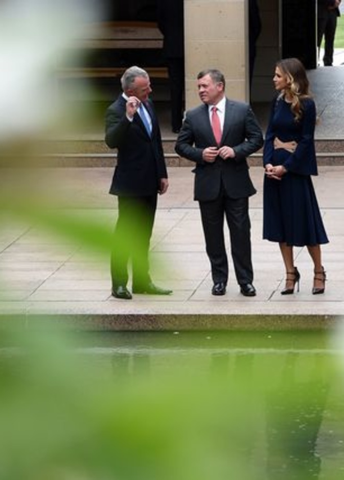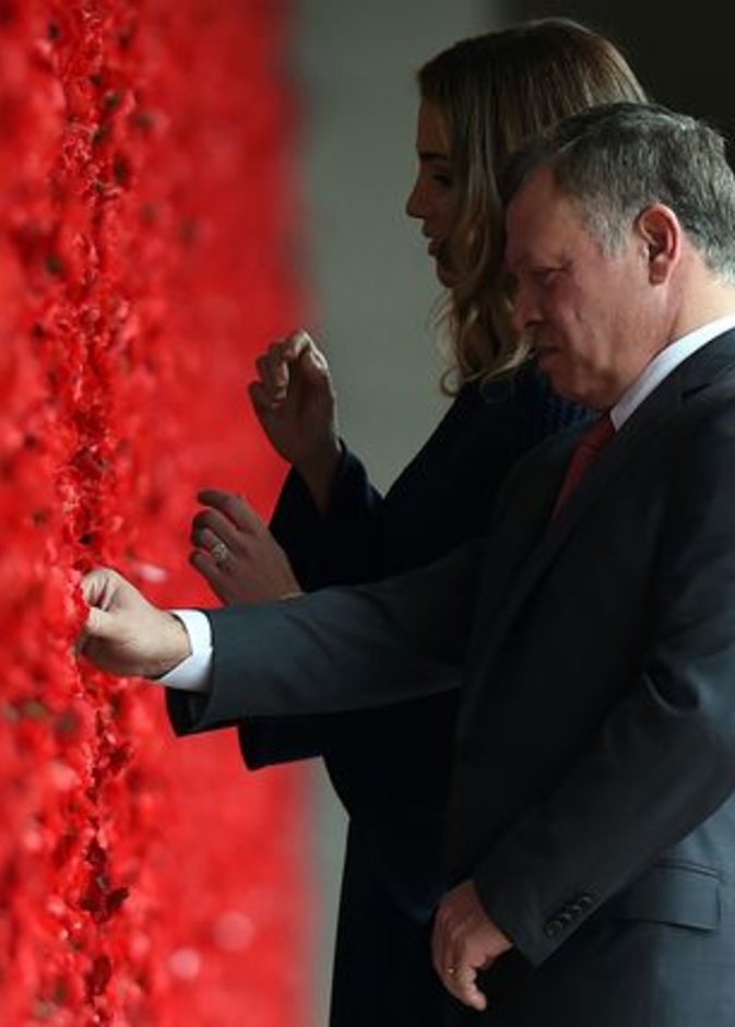 شوهد الملك عبد الله الثاني (King Abdullah II) ملك الأردن، وزوجته الملكة رانيا (Queen Rania) وهما يسيران بجانب حائط زهور الخشخاش أثناء زيارتهما للنصب التذكاري للحرب الأسترالية في مدينة كانبيرا أمس، وكان الملك عبد الله والملكة رانيا سافرا إلى أستراليا بناء على دعوة وجهها لهما الحاكم العام لأستراليا بيتر كوسجروف (Peter Cosgrove).