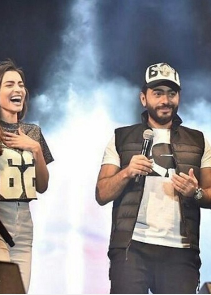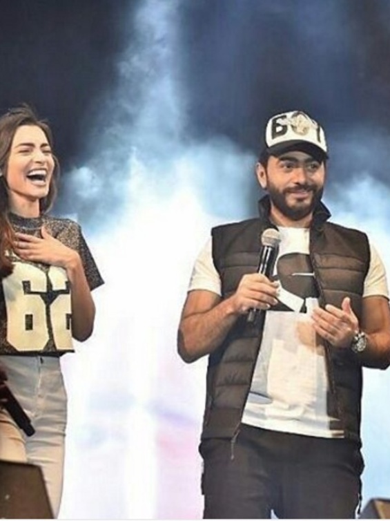 اما العروس كارمن سليمان فظهرت باول صور لها بعد زواجها في حفل النجم تامر حسني حيث صعدت مع عريسها والتقطت الصور مع تامر على المسرح معربة عن محبتها الكبيرة لزوجها امام الجمهور.