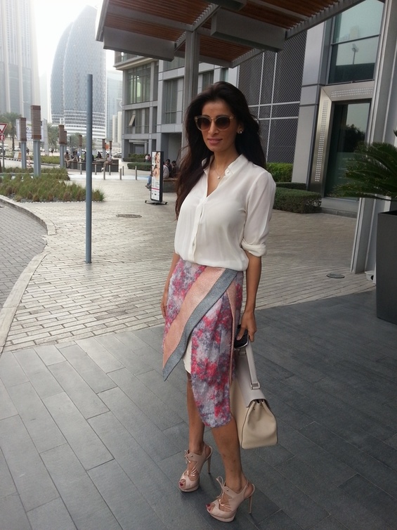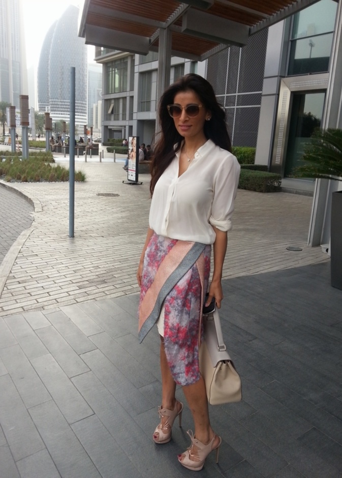 رصدنا خبيرة الموضة روزمن مانجي Rosemin Manji بكامل أناقتها في شوارع دبي. مانجي تبدو جميلة بتنّورة ذات تدرّجات زهرية وبنفسجية متنوّعة، إلاّ أنّ الحذاء ذات الكعب العالي، كان أكثر ما أعجبنا في هذه الإطلالة.