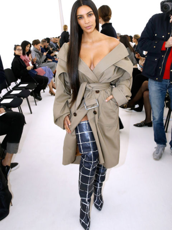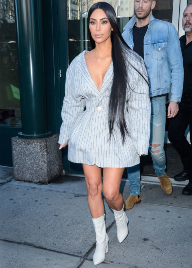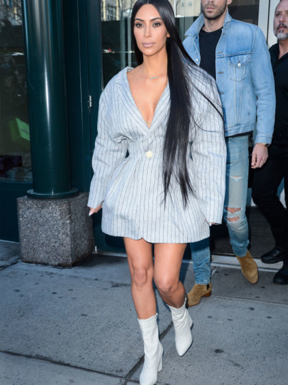 في آخر إطلالات كيم كارداشيان Kim Kardashian رأيناها ترتدي السترة أو البليزر الأزرق والأبيض مع جزمة متوسطة الطول ولها كعب عالي.